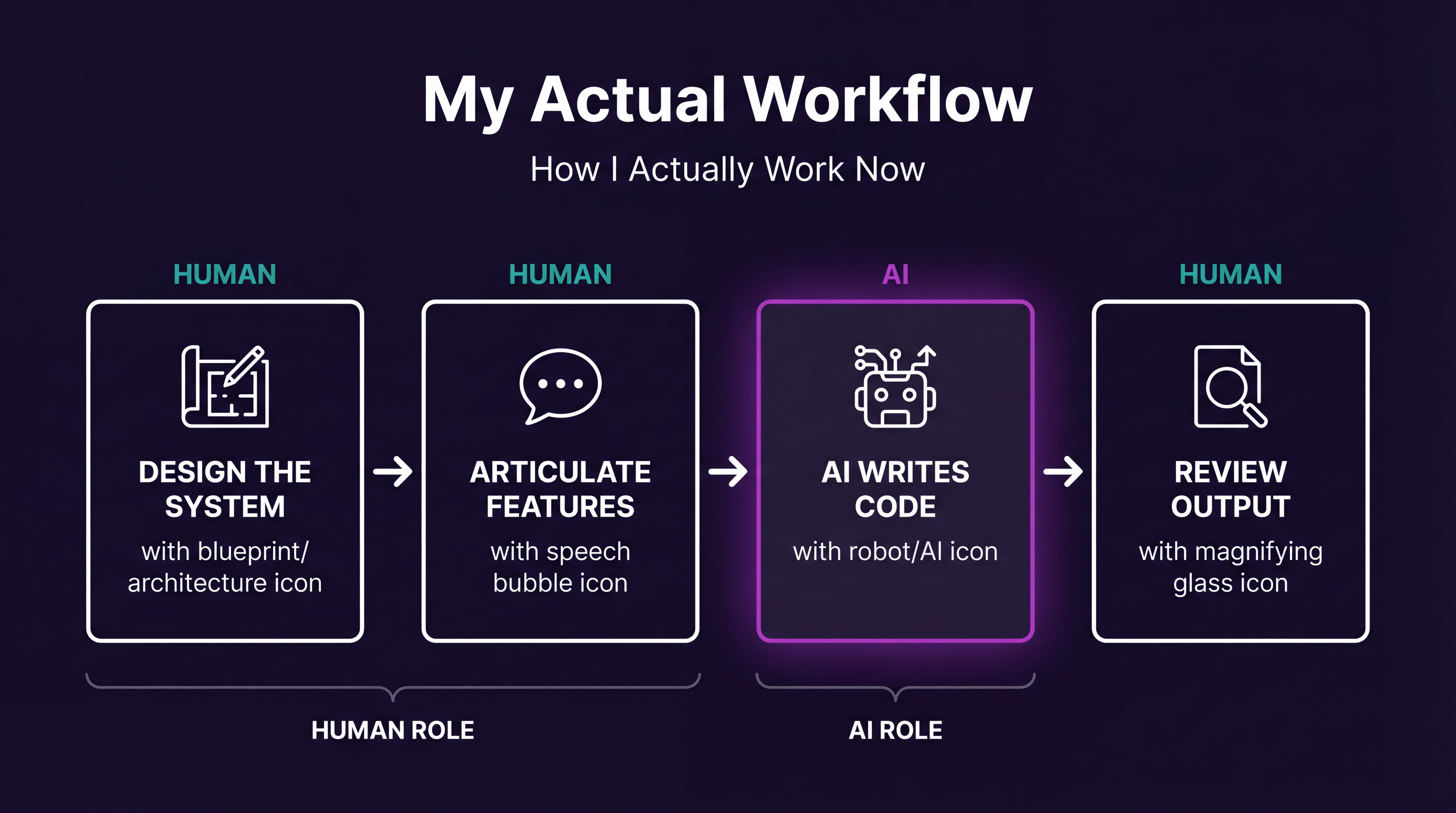 AI writes the code. I design the system. I articulate the features. I review the output.