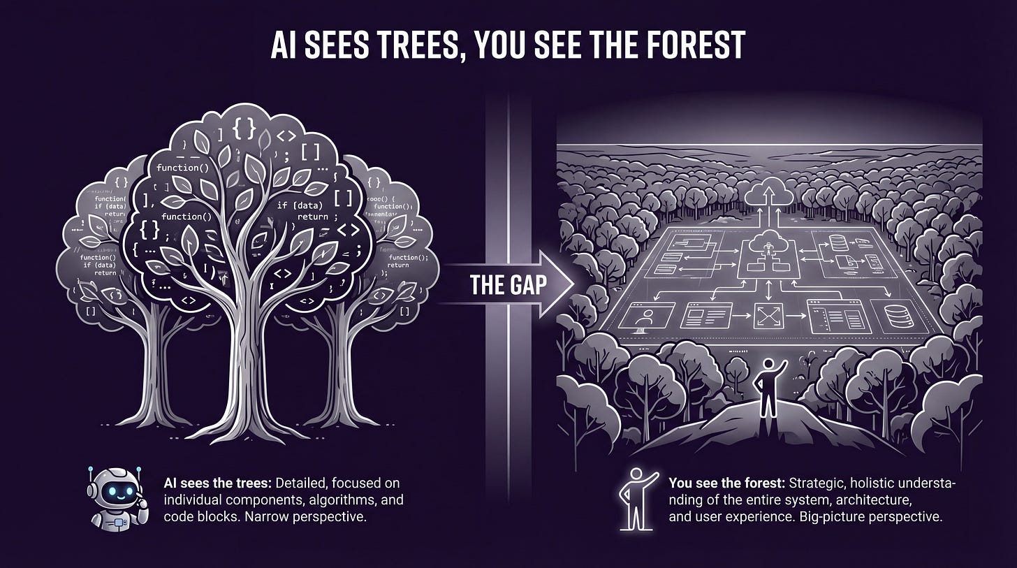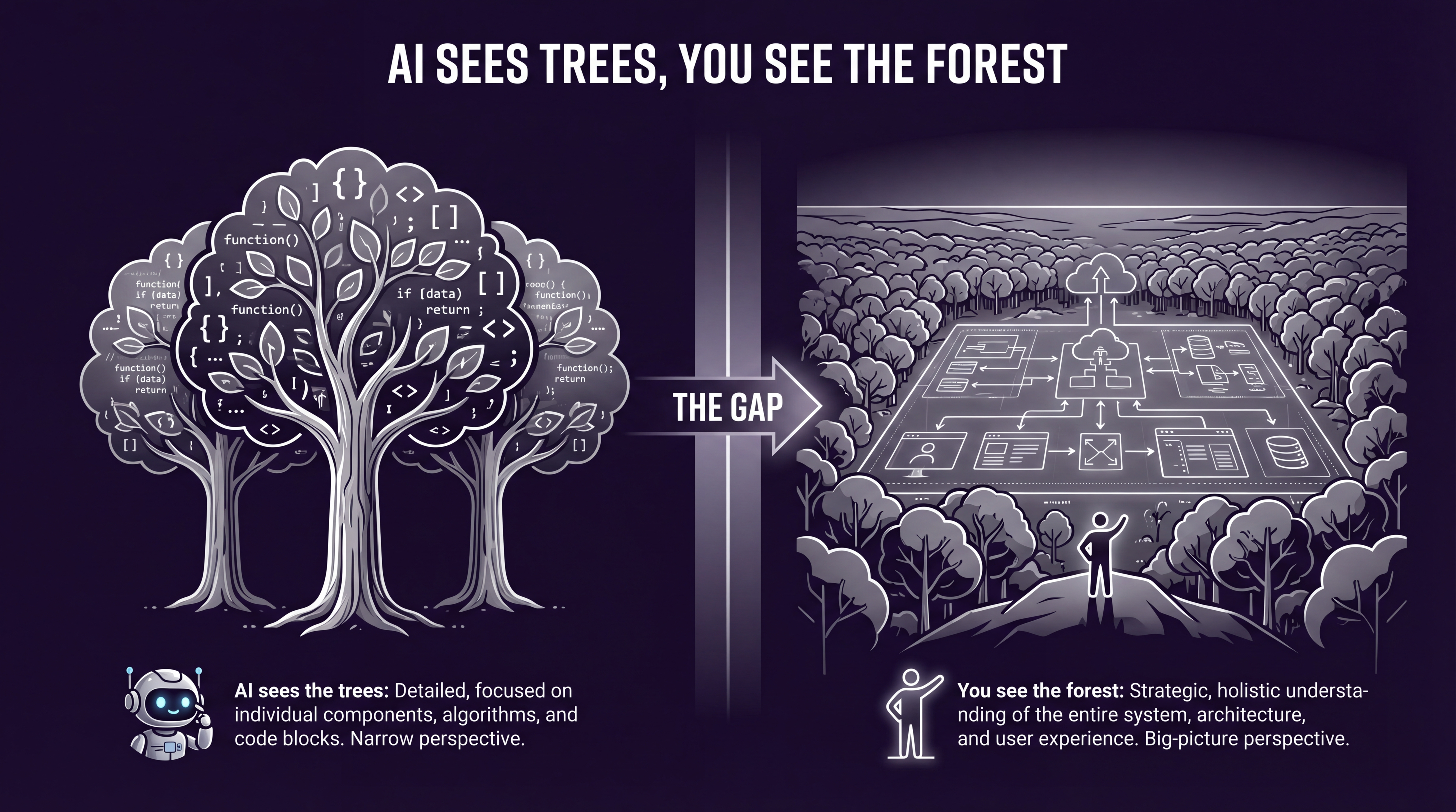 AI can’t see the forest. It’s incredible at implementing the feature—it sees the trees—but it doesn’t know the existing patterns in your application. It doesn’t understand the architecture.